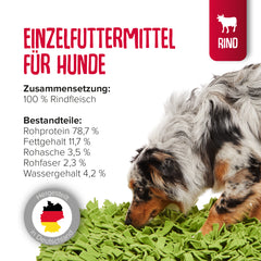 Schonend luftgetrocknetes, reines Muskelfleisch vom Rind – gewolft, behutsam getrocknet